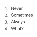 d. Almost never, because if a is the right answer, then the learner doesn’t have to read all the other options we spent so much time writing and revising, and where’s the ROI in that?